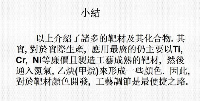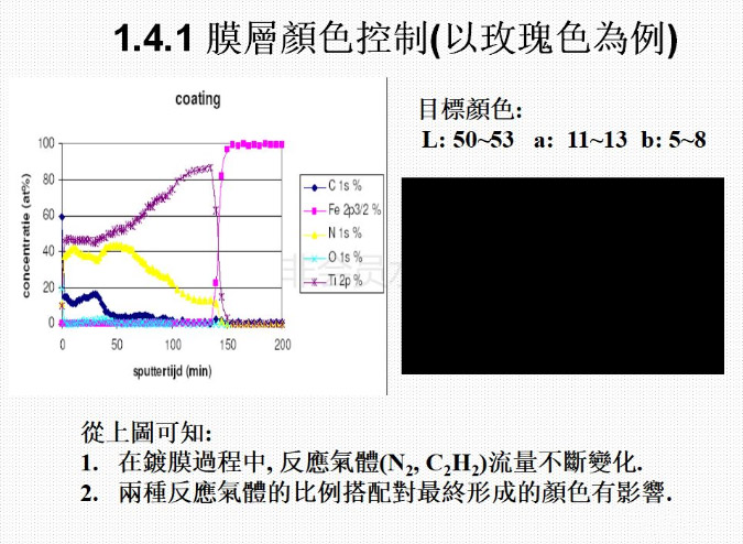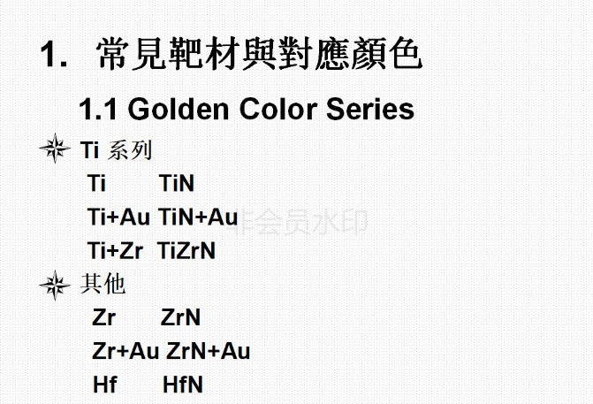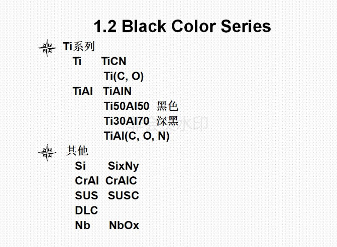 6)、目前能夠做出的膜層的顏色有深金黃色,淺金黃色,咖啡色、古銅色、灰色、黑色、灰黑色,七彩色等。通過控制鍍膜過程中的相關(guān)參數(shù),可以控制鍍出的顏色;鍍膜結(jié)束后可以用相關(guān)的儀器對(duì)顏色值進(jìn)行測(cè)量,使顏色得以量化,以確定所鍍出的顏色是否滿足要求。