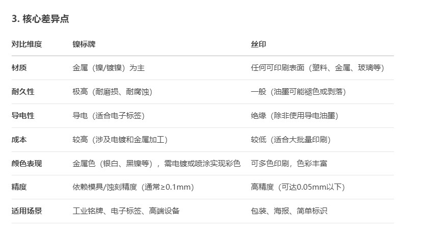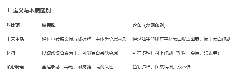 鎳標(biāo)牌和絲印(絲網(wǎng)印刷)是兩種完全不同的工藝,用途、制作方式和最終效果都有顯著區(qū)別。以下是它們的核心差異對比: