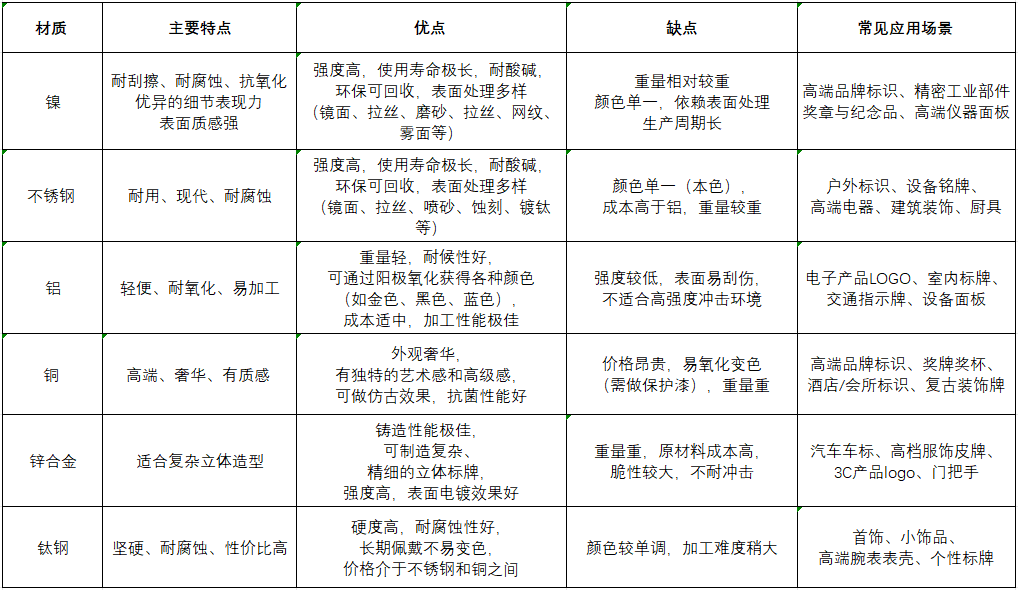 主流金屬標牌材質對比一覽表
