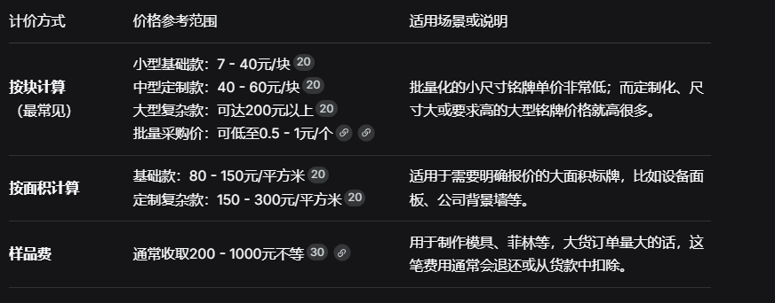 簡單的道理:尺寸越大,材料和加工成本越高。同時,異形或非常規形狀的銘牌可能需要額外的模具費或沖切工序,也會推高價格。